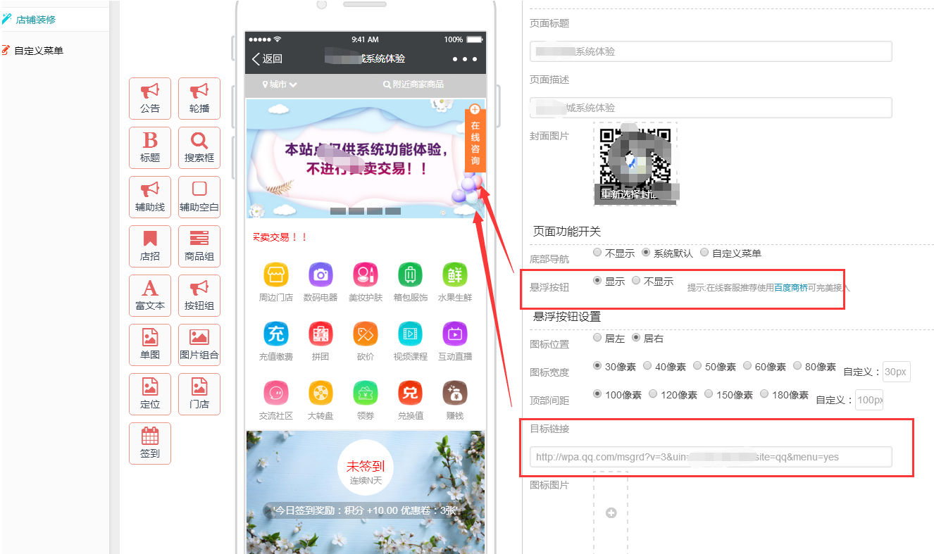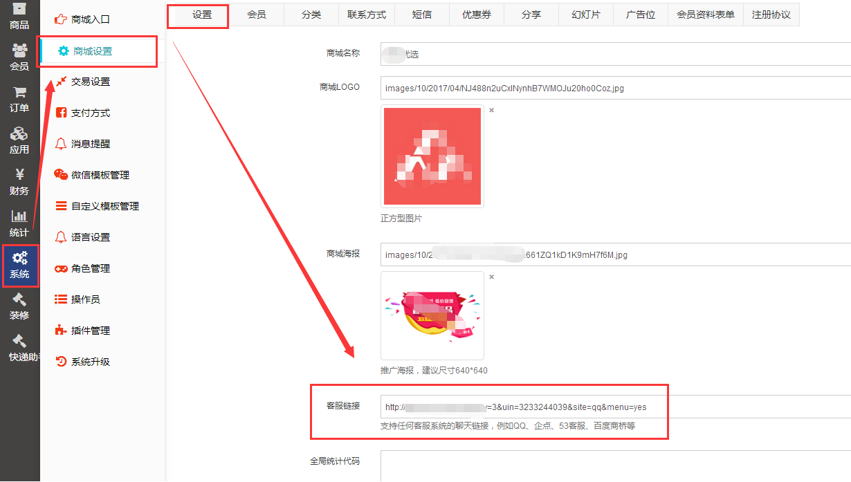 新零售商城支持设置客服链接,用户通过商品详情页客服按钮、帮助中心人工客服、店铺装修首页悬浮客服按钮等位置可以发起客服咨询,本文讲解使用QQ设置客服链接的方法。1、首先访问http://shang.qq.com/v3/index.html ,请使用QQ号登录!2、登录后点击‘推广工具’3、复制红框中的链接:http://wpa.qq.com/msgrd?v=3&uin=913768135&site=qq&menu=yes注意uin=后面是您要设置的客服QQ号,如果没有显示,请刷新页面即可4、将这个链接填写到新零售商城系统--系统--商城设置--客服链接中即可。5、如果您使用的是店铺装修,可以将客服链接放到悬浮按钮、DIY页面任何链接都可以,用户点击链接即可发起QQ客服咨询。注意:使用QQ客服,用户手机必须安装手机QQ,否则发起聊天失败!建议可考虑使用百度商桥:https://www.mada315.com/h-nd-161.html#_np=0_3040_26_0、营销QQ等!