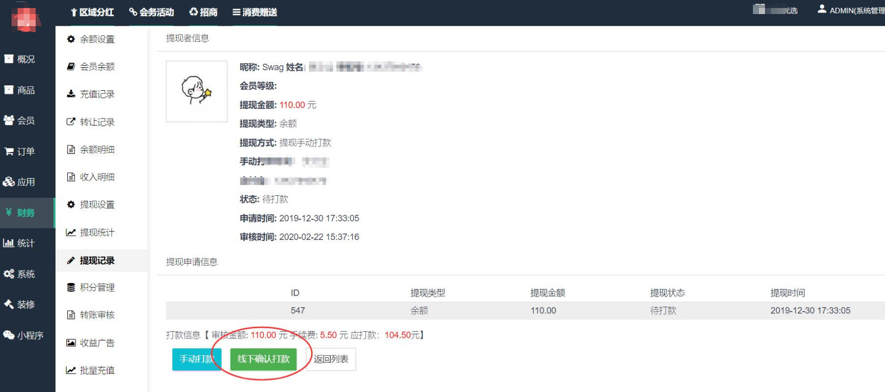 使用场景:用户使用微信提现、支付宝提现余额,但因为第三方打款异常无法正常完成打款,可使用线下确认打款、重新打款等方式完成打款流程。如下图